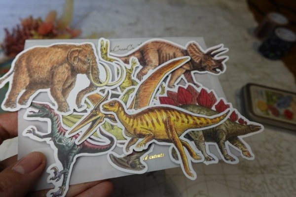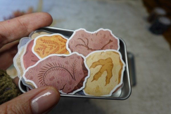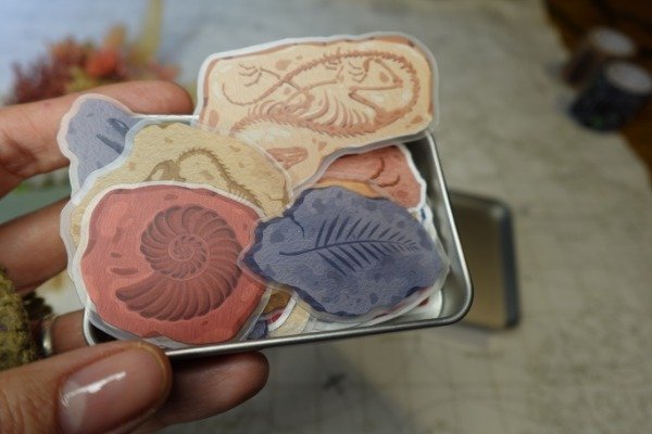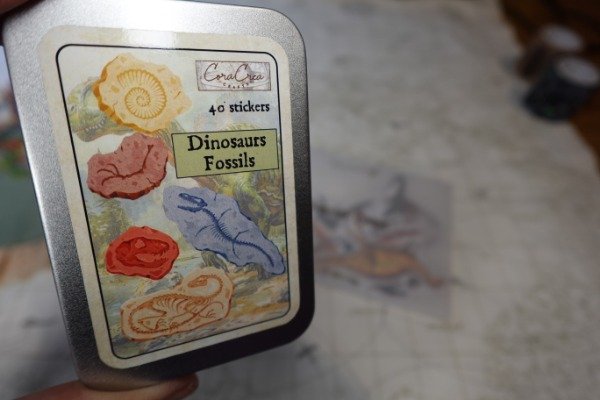 Lata de Stickers de fósiles, son 40 y son preciosos. De regalo van unos dinos troquelados (no sticker)