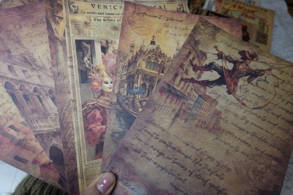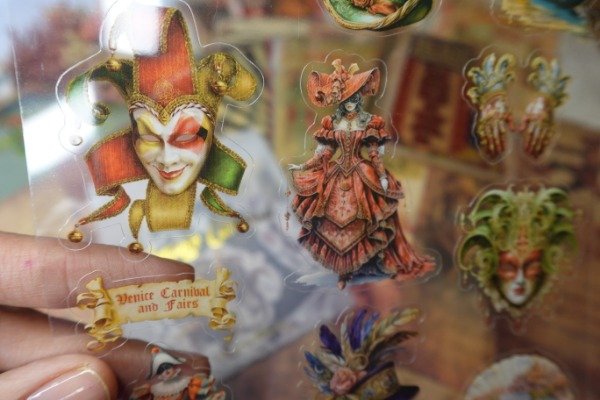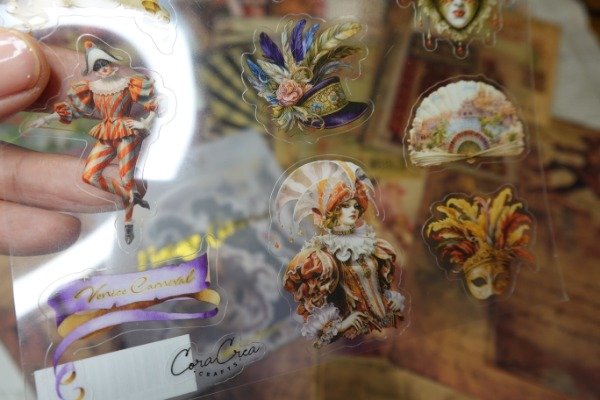 Seis láminas de papel de alto gramaje con diseños de carnaval más plancha de stickers A5