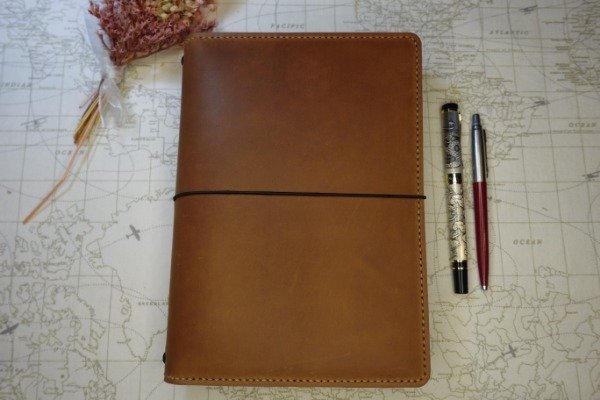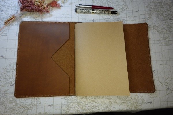 incluye tres cuadernilos con tapas Kraft de 60 páginas de papel bookcel de 80grs y un portalapiceras para elástico